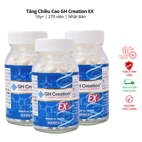 GH Creation EX là thực phẩm bảo vệ sức khỏe nổi bật đến từ Nhật Bản, được nghiên cứu và phát triển nhằm hỗ trợ quá trình phát triển chiều cao tự nhiên, đặc biệt trong giai đoạn dậy thì – từ 10 đến 30 tuổi. Sản phẩm được sản xuất bởi Japan Amino Acid Co., Ltd., áp dụng công nghệ tiên tiến hỗ trợ cơ thể tăng tiết hormone tăng trưởng (GH) một cách tự nhiên và an toàn.